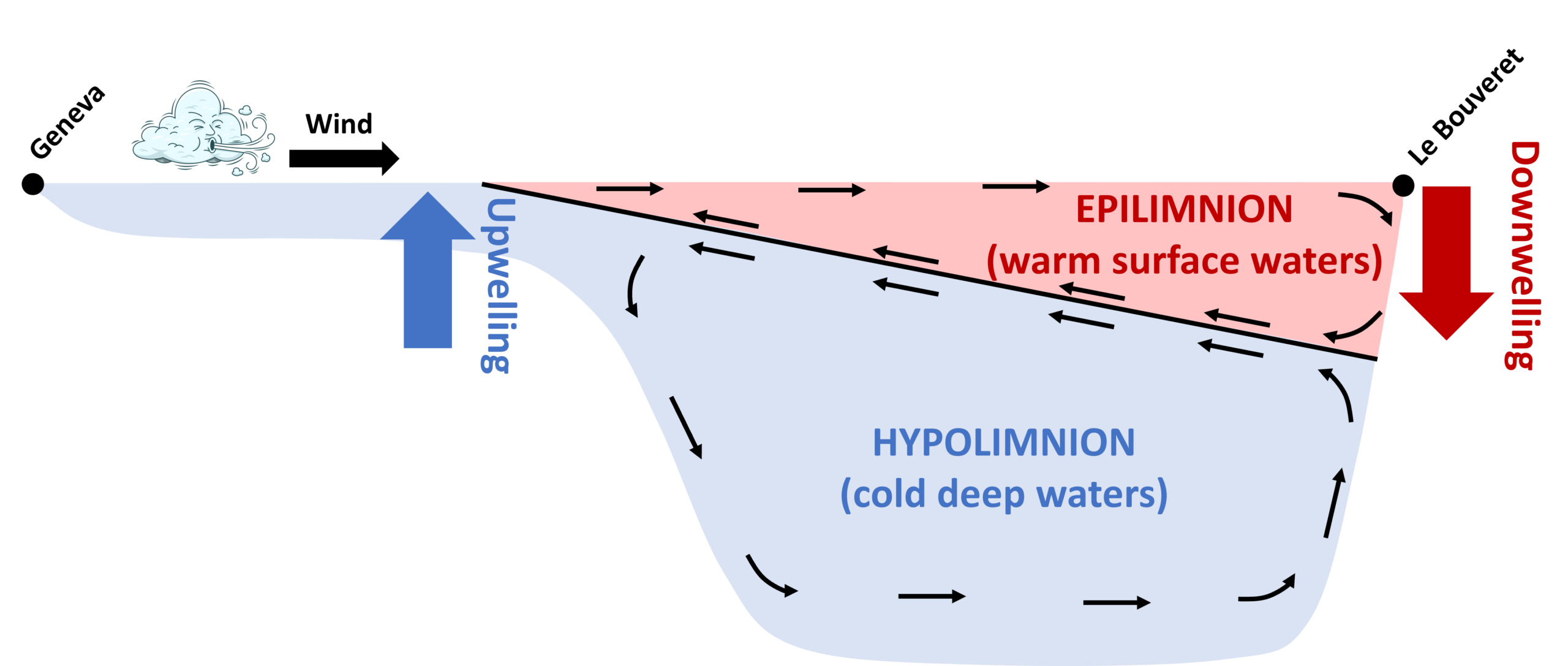 La réponse du Léman à la tempête a été très différente entre Genève (extrémité ouest du lac) et Le Bouveret (extrémité est). Les forts vents de sud-ouest ont généré des courants de surface dirigés vers le nord-est, atteignant des vitesses de 0.5 m/s entre Genève et le centre du lac (Fig. 2). Ces courants ont poussé les eaux de surface vers Le Bouveret et ont fait remonter à la surface, à Genève, des eaux profondes et froides — un processus appelé upwelling (Fig. 3). En quelques heures seulement, la température de surface à Genève est ainsi passée de 16°C à 6°C !