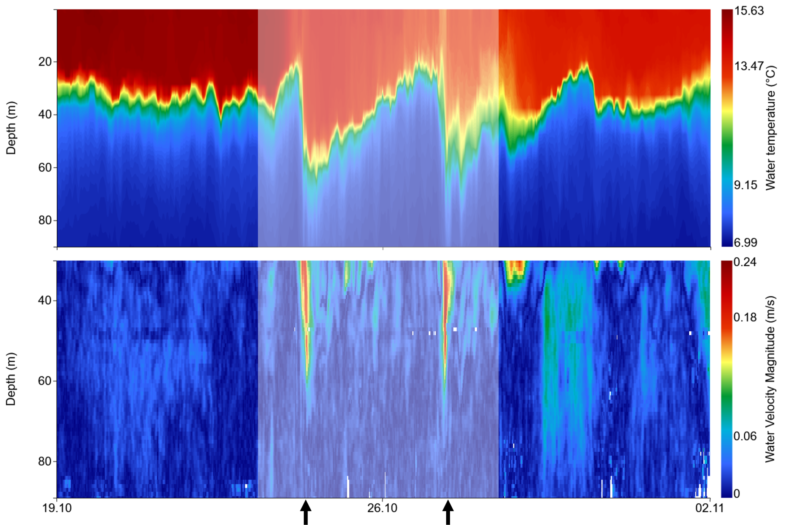 Figure 5 – Température de l’eau (panneau supérieur, 0–90 m de profondeur) et vitesse des courants (panneau inférieur, 30–90 m de profondeur) mesurées à la plateforme LéXPLORE en fonction du temps et de la profondeur. Les deux flèches indiquent le passage de deux ondes de Kelvin. La zone ombrée représente la période de vents forts montrée à la Fig. 1. Données disponibles publiquement sur https://www.datalakes-eawag.ch/datadetail/448 (température) et https://www.datalakes-eawag.ch/datadetail/599 (vitesse).